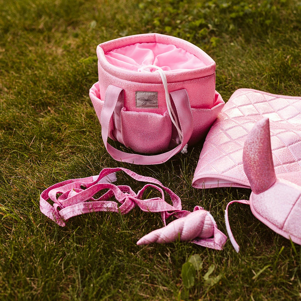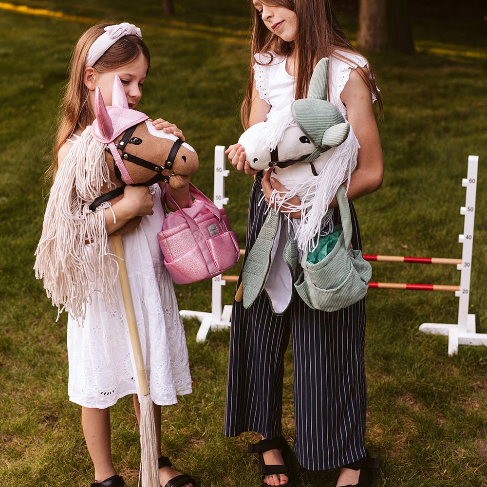 Mit der rosa Glitzer-Pflegetasche hat dein Kind seine liebsten Hobby-Horse-Accessoires immer ordentlich verstaut. Bürsten, Pflegeutensilien und kleine Schätze finden ihren festen Platz – so macht Aufräumen fast genauso viel Spaß wie das Spielen selbst.