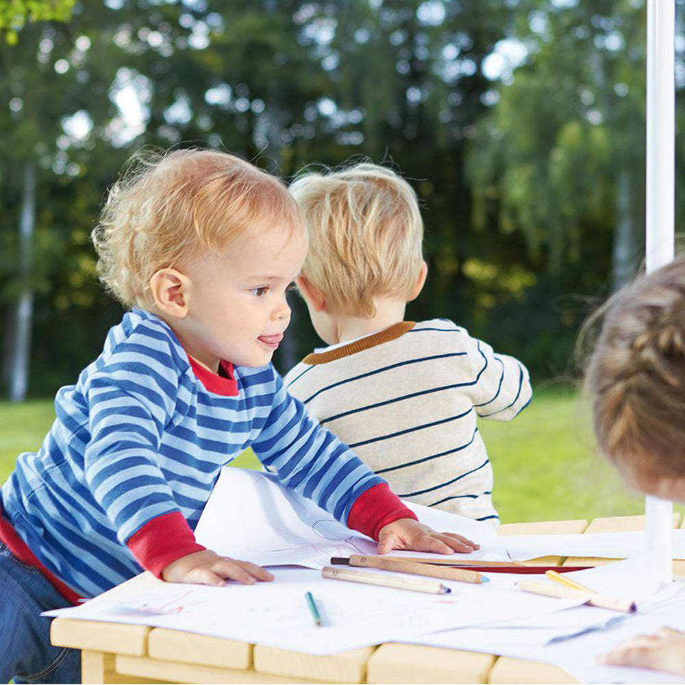 Gefertigt aus massivem, unbehandeltem Nadelholz ist die Garnitur stabil, langlebig und umweltfreundlich. Die Aufnahme für einen Sonnenschirm bietet zusätzlichen Schutz an sonnigen Tagen – praktisch, sicher und perfekt für den Alltag mit der ganzen Familie.