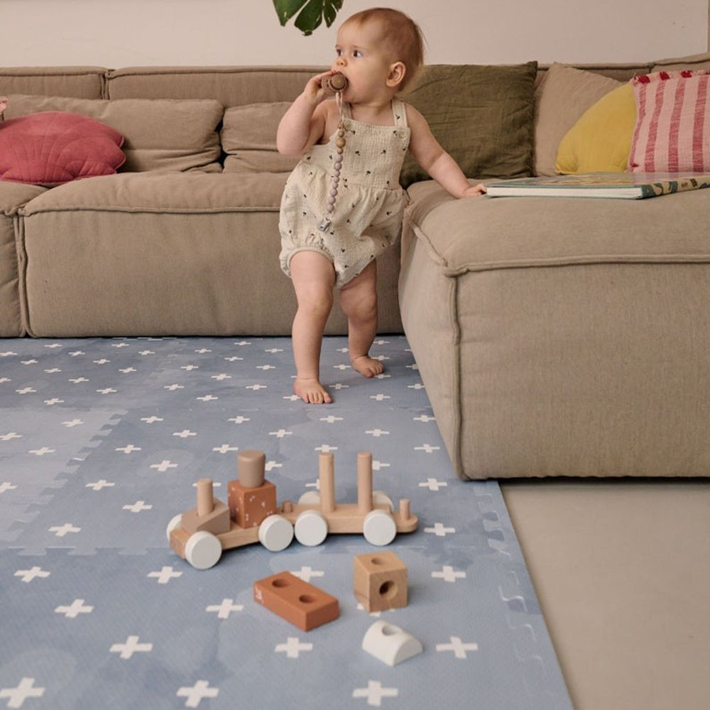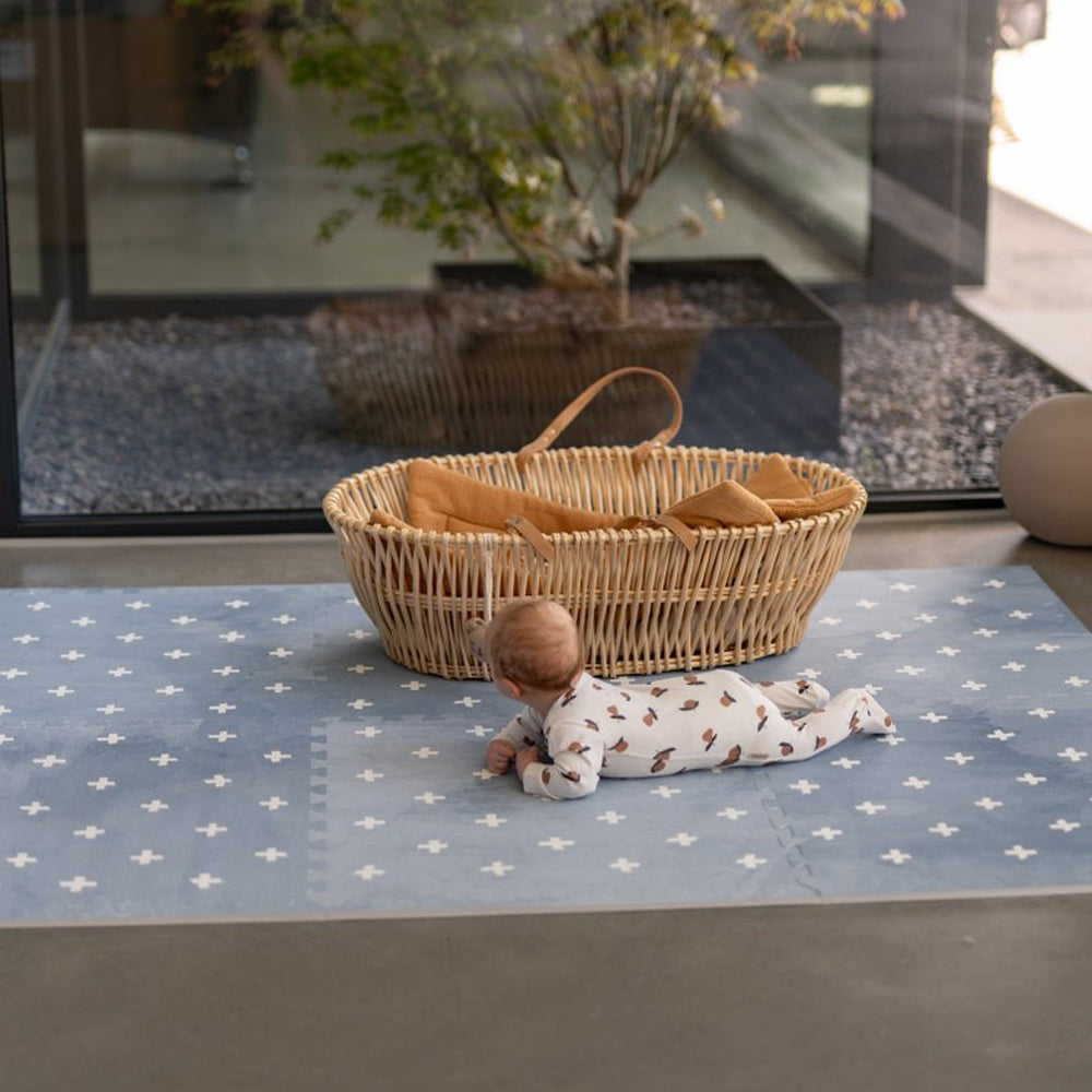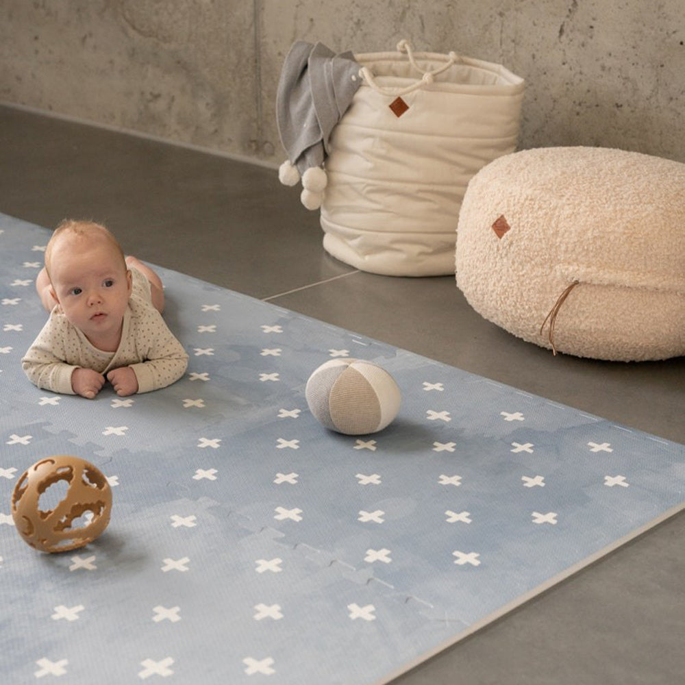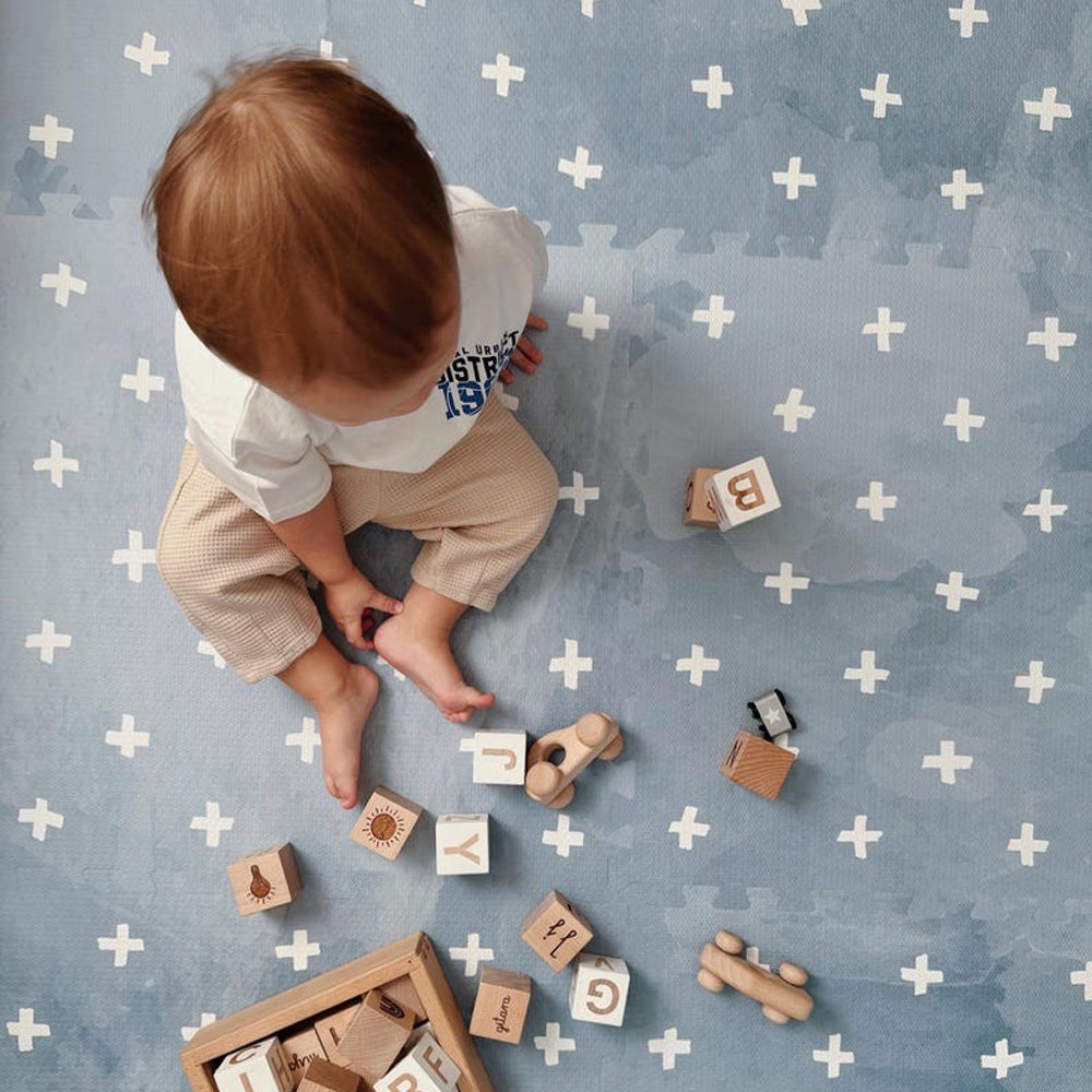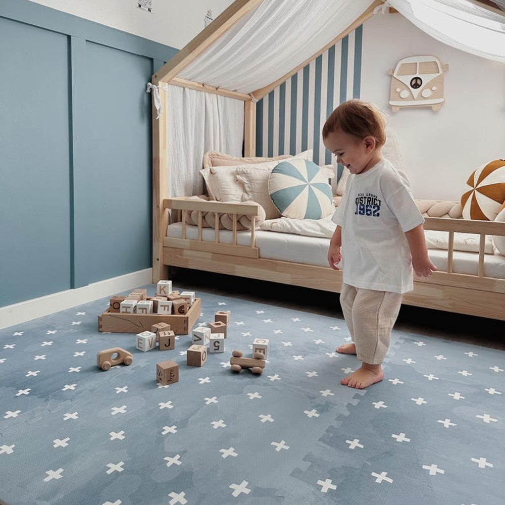 Das Kreuzmuster in frischem Azurblau bringt einen Hauch Lebendigkeit ins Kinderzimmer und passt dank seines minimalistischen Designs perfekt zu jedem Wohnstil. Mit ihrer zusammengepuzzelten Größe von 120 × 180 cm bietet die Matte ausreichend Platz für ausgiebiges Spielen – und durch das erweiterbare Design kannst du sie jederzeit vergrößern, wenn dein Kind mehr Raum zum Toben braucht.