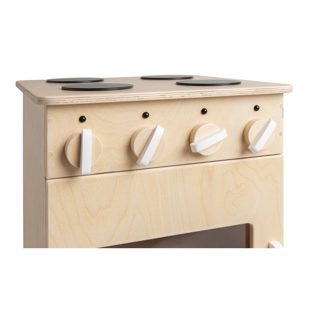 Der aus hochwertigem Birkensperrholz gefertigte Herd überzeugt durch seine robuste Bauweise und die sanft schließende Tür mit Soft-Close-Funktion. Alles ist kindgerecht verarbeitet, sodass kleine Hände gefahrlos spielen und ausprobieren können.