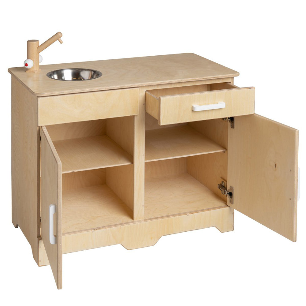 Die detailreiche Gestaltung mit Spüle, Wasserhahn und zwei geräumigen Schränken bietet jede Menge Platz für kleine Töpfe, Teller und Spiellebensmittel. Die farbigen Markierungen an den Wasserhahnknöpfen regen zum Lernen an – so wird spielerisch Wissen über Alltag und Ordnung vermittelt.
