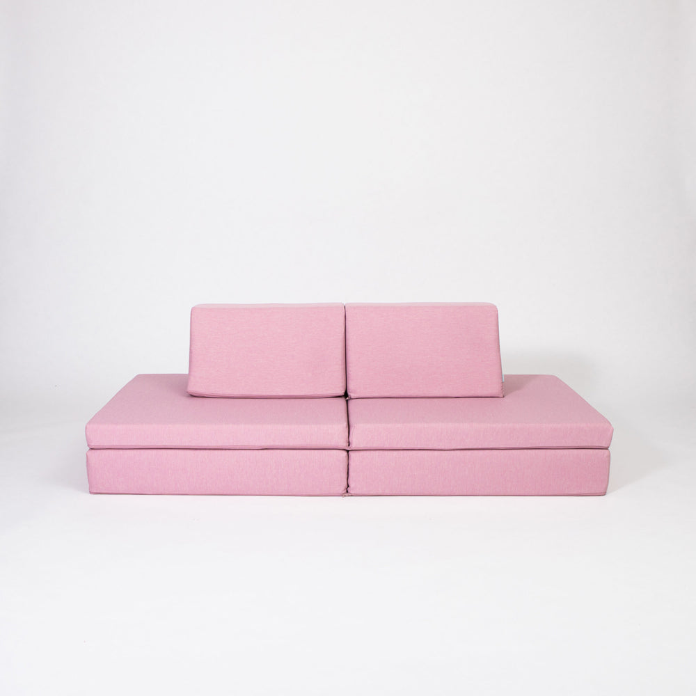 Das Set besteht aus einer dickeren Basismatratze, einer flexiblen Untermatratze und zwei trapezförmigen Kissen, die sich zu einem Sofa, Zelt oder kreativem Bauwerk kombinieren lassen. Du kannst die Elemente leicht umstellen, zusammenklappen und platzsparend verstauen – perfekt für den Alltag in kleinen Räumen.