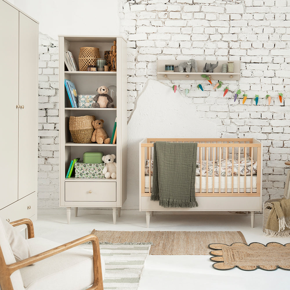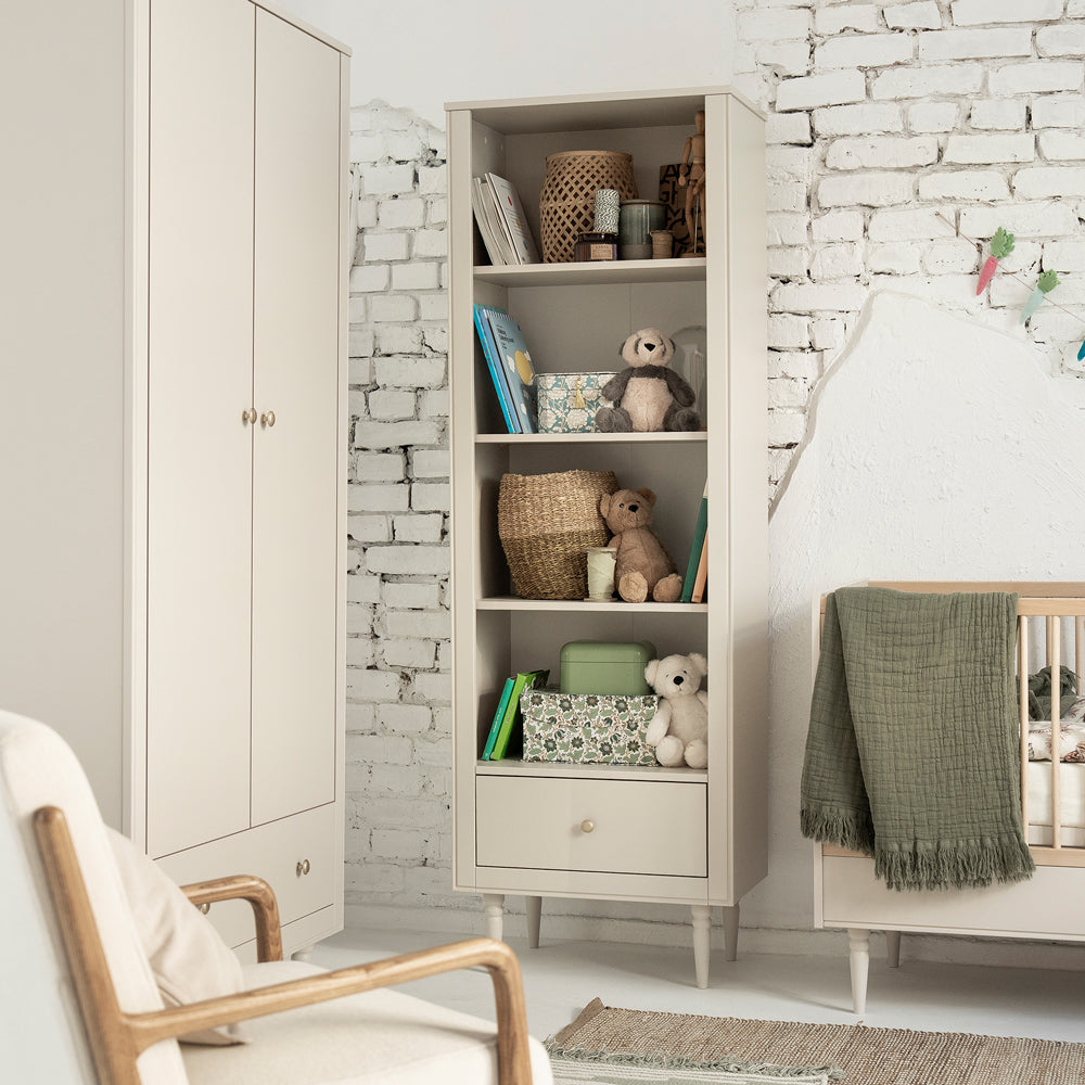 Dieses Standregal wird schnell zum Lieblingsort deines Kindes: Lieblingsbücher, Kuscheltiere und kleine Erinnerungen finden hier ihren festen Platz – übersichtlich, griffbereit und wunderschön präsentiert. Die edle Champagnerfarbe mit goldfarbenem Knauf an der Schublade schafft eine warme Atmosphäre, in der sich dein Kind sofort zuhause fühlt.