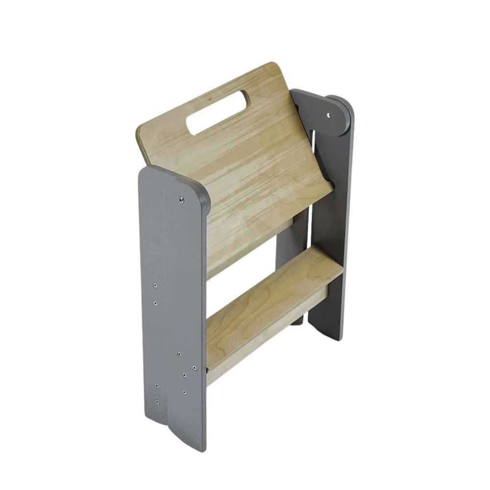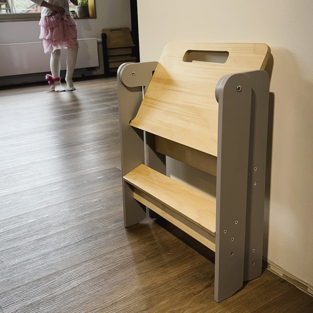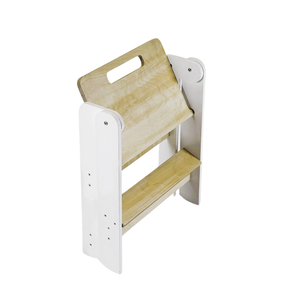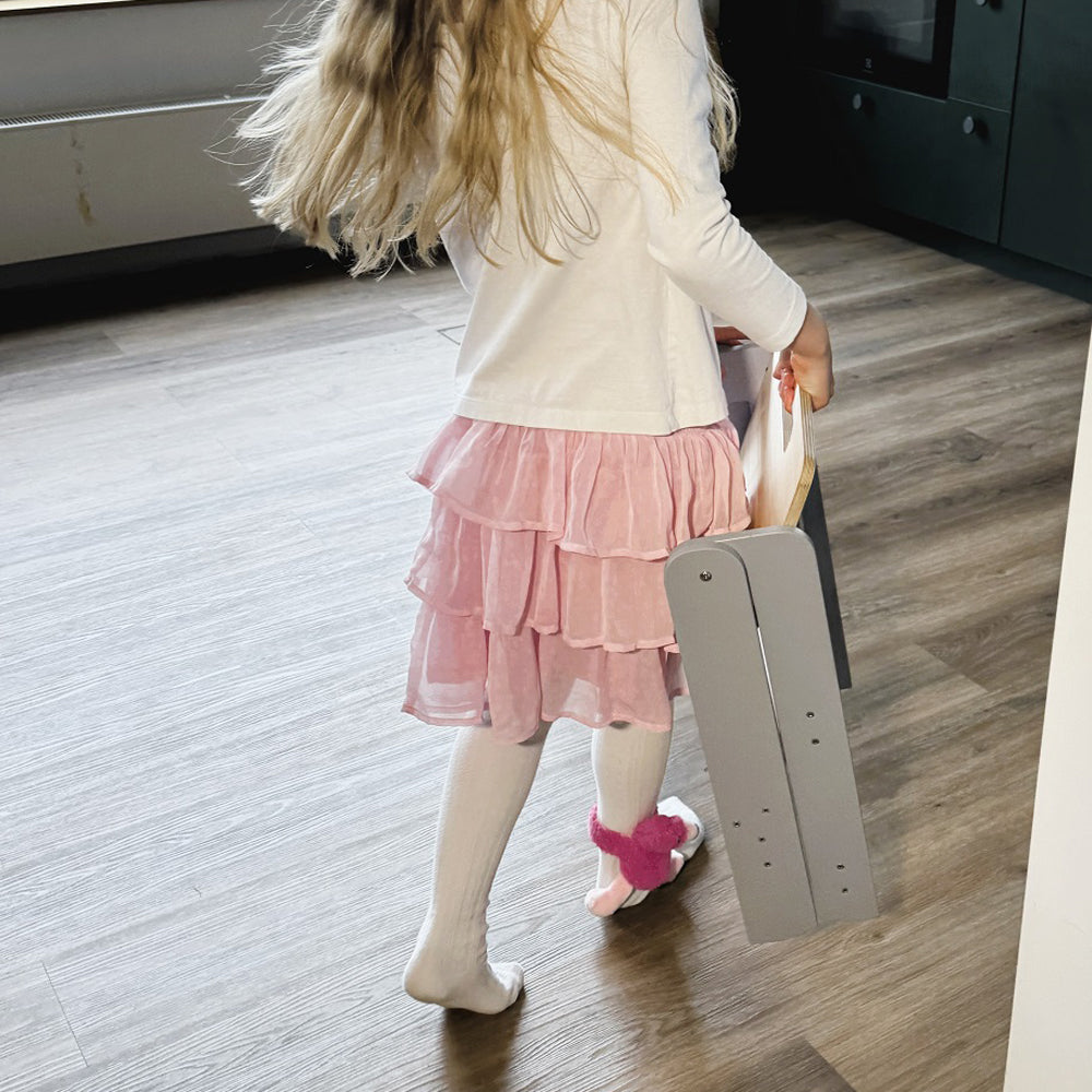 Der Hocker ist so leicht, dass dein Kind ihn selbst bewegen kann, und lässt sich flach zusammenklappen, wenn er gerade nicht gebraucht wird. So bleibt alles ordentlich und der Hocker verschwindet fast wie von Zauberhand in jeder Ecke.