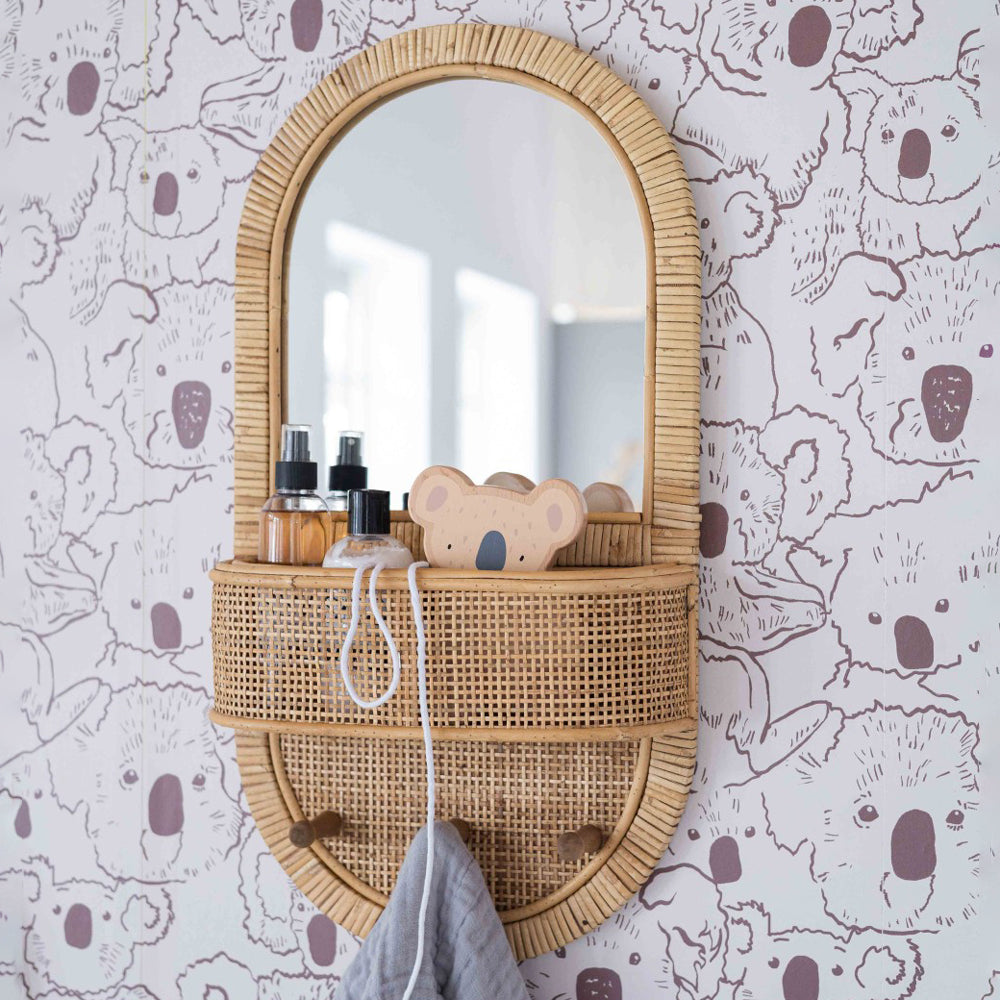 Mit seinem natürlichen Rattan-Look, dem integrierten Körbchen und drei stabilen Haken ist der Wandspiegel ein stilvoller Hingucker, der sowohl im Kinderzimmer als auch im Bad eine gute Figur macht. Die zusätzliche Ablage eignet sich perfekt für kleine Schätze wie Haaraccessoires oder Lieblingsschnuller – griffbereit und ordentlich verstaut.